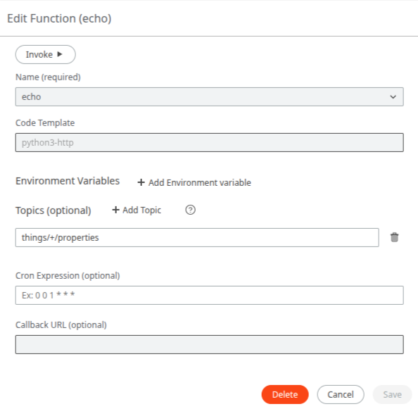 - Use the Edit dialog to configure a cron schedule to invoke the Function on. An optional Callback URL can be provided to have the Function output POSTed to.