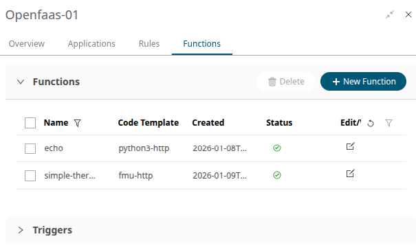 In the Functions tab you can manage Functions and Triggers as defined on the Edge Asset. The applications “App - ECP Functions Stack” and “App - ECP Support Functions” are required.
