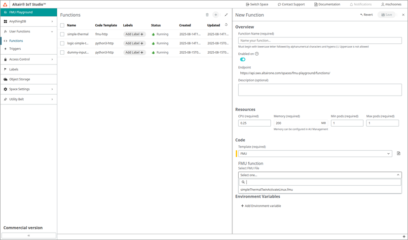 - Click +New Function and enter the name simple-thermal.
