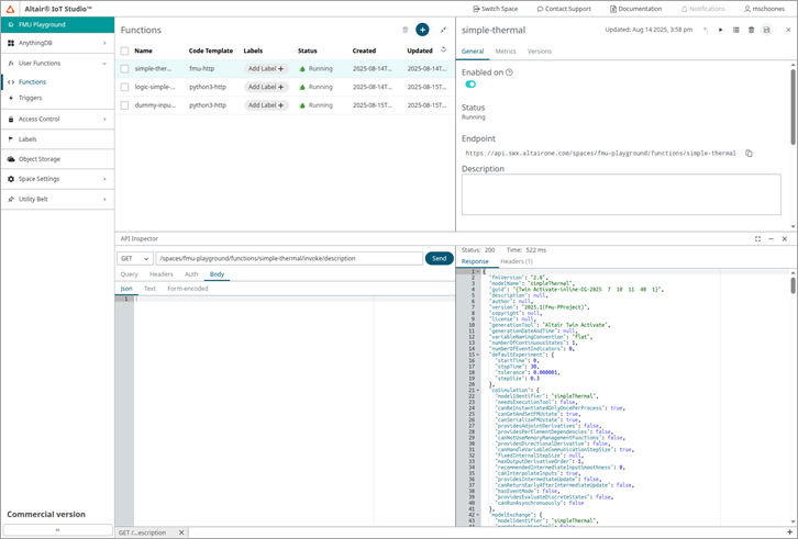 /descriptionwith/inputs,/outputsor/parametersrespectively and running the request.Note: If you run the simulation itself, you need to reset the state of the FMU before you continue with the tutorial. You can reset the state by runningPUTwith/invoke/reset.