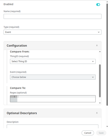 For the Threshold listener, the Compare From section needs to have a Thing and Property selected. The threshold value is entered in the Compare To section.