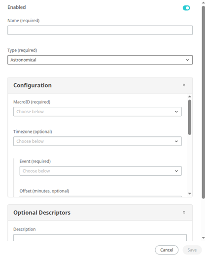 For Astronomical schedule, the event, the latitude, the longitude and either "every X day" or "day of week" are required.